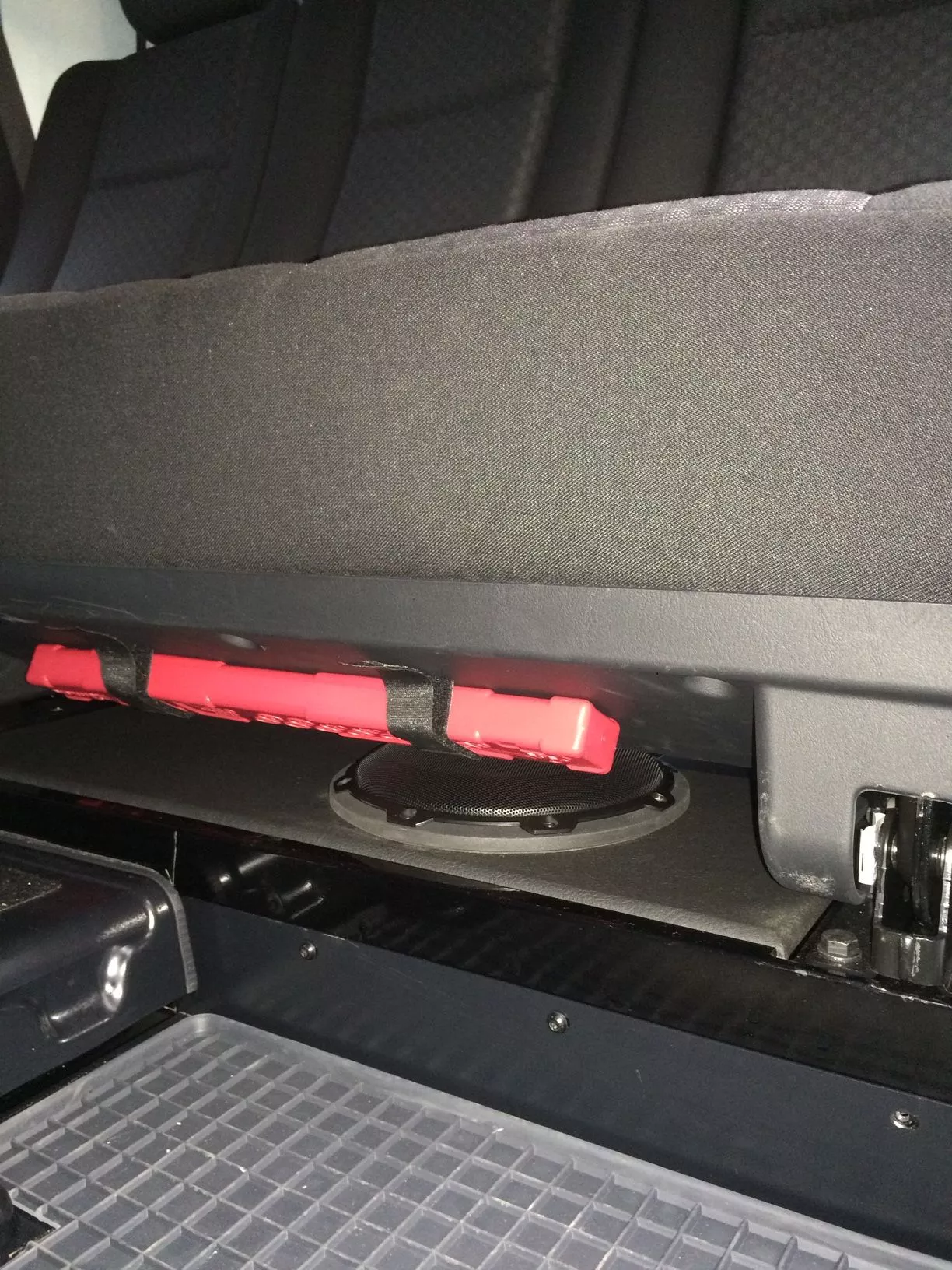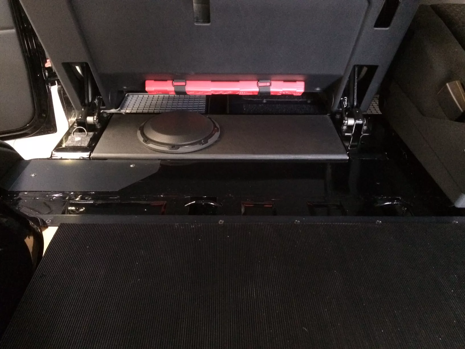 Subwoofergehäuse für Mercedes Benz G463 Professional ab 2016. Das Gehäuse findet Platz in der Mulde unter dem linken Rücksitz und passt nahezu bündig hinein. Es ist aus Verbundmaterial gefertigt, speziell für den "G" konzipiert und mit schwarzem Kunstleder bezogen. Die Bestückung besteht aus einem Helix K8W-Subwoofer mit 150W RMS Belastbarkeit und verleiht dem G-Modell das fehlende Fundament. Für den Betrieb eignen sich Verstärker ab 100Watt Leistung.