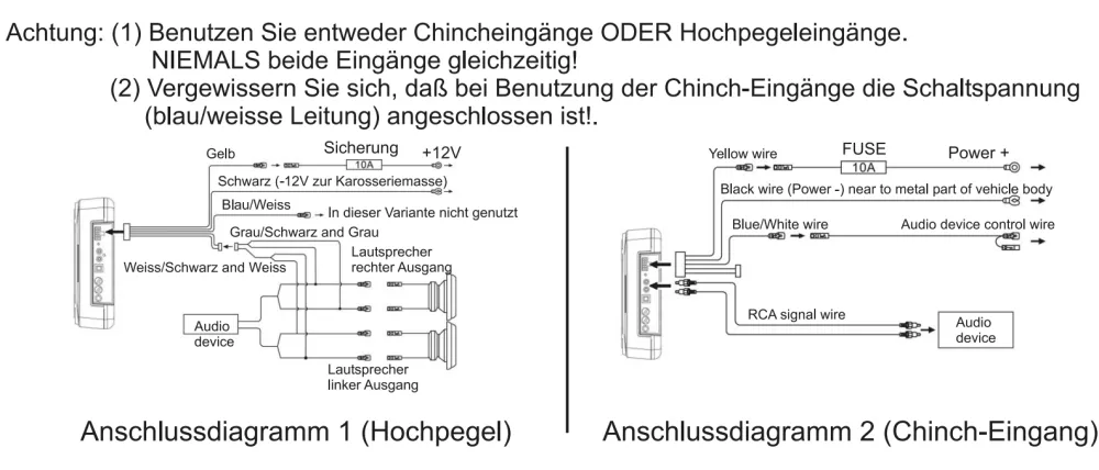 - High Level Eingang für Originalradios ohne Chinchausgang